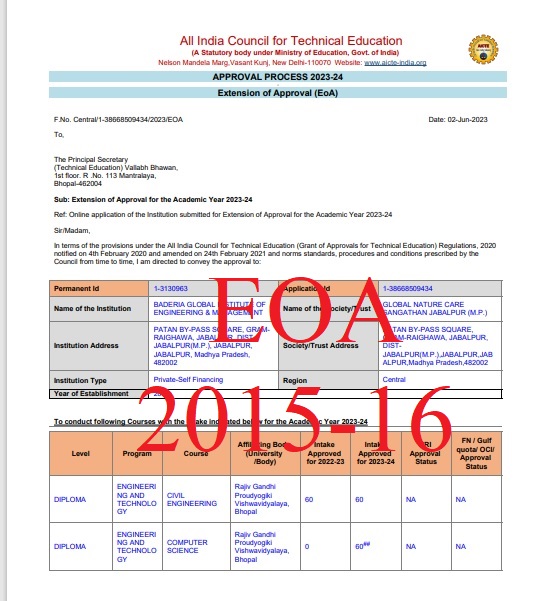 Baderia Global Institute of Engineering and Management was established by Global Nature Care Sangathan (GNCS), Jabalpur to promote quality education in various Technical , Medical & Management fields.